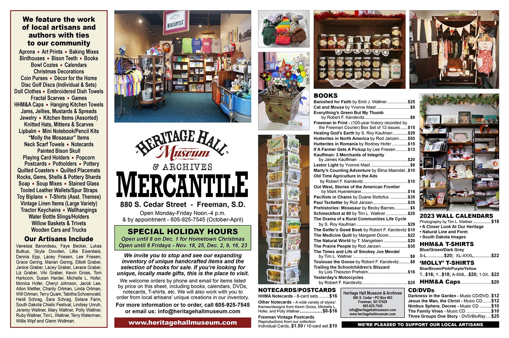 Copyright © Heritage Hall Museum & Archives | 605.925.7545 | info@heritagehallmuseum.com | PO Box 693, 880 S Cedar St, Freeman, SD 57029